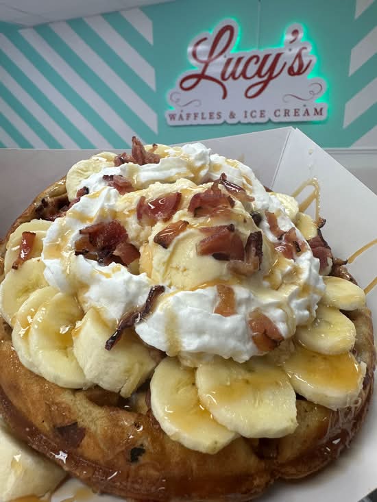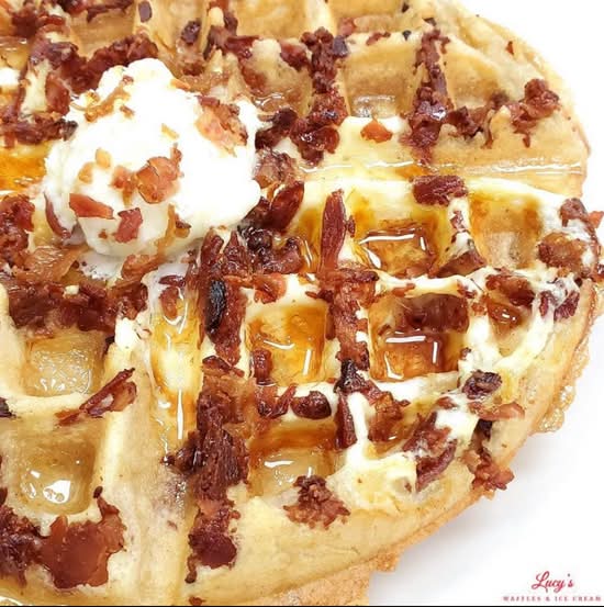 Bacon inside the waffle topped w/ Vanilla ice cream scoop, bananas, bacon, caramel & maple syrup!