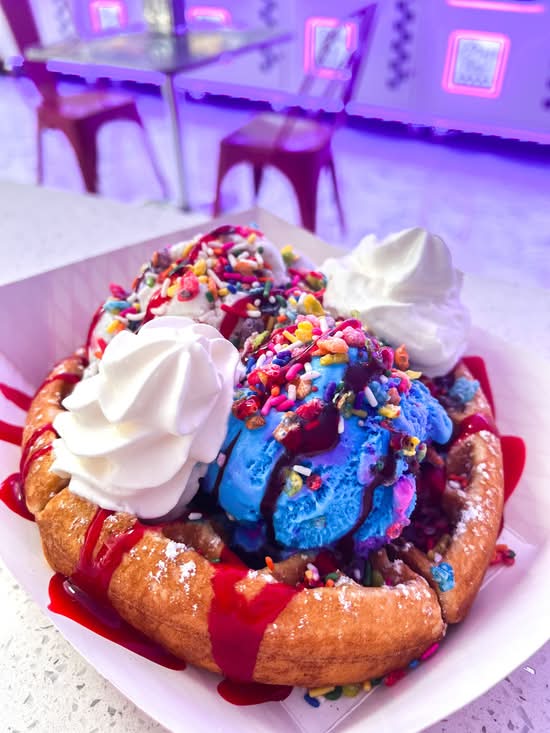 Cotton Candy & Birthday Cake ice cream, rainbow sprinkles, fruity pebbles & strawberry syrup!