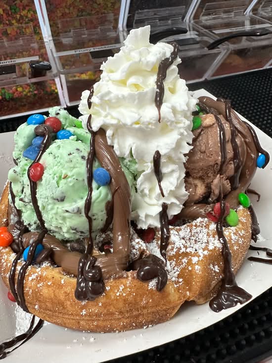 Rocky Road & Choe Mint ice cream, mini M&M’s, Nutella, & chocolate syrup!